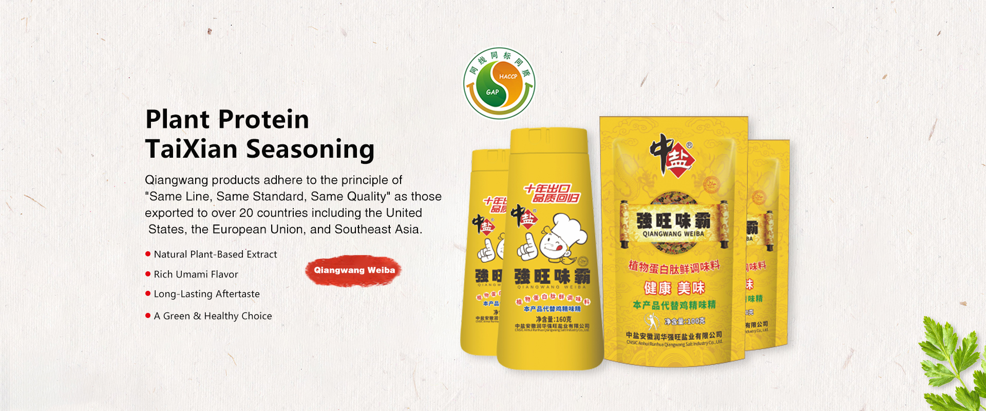 Anhui Qiangwang Group is located in the Jieshou High-Tech Industrial Development Zone of Fuyang, Anhui Province. It is an export-oriented private enterprise integrating seasoning food processing, food technology research and development, and international trade. Established in 2006, the group occupies a total area of over 410 acres. Its main products include functional compound seasonings, multi-variety salt, and personalized functional foods. The market primarily distributes across more than 20 countries and regions, including Europe, America, Africa, the Middle East, and Southeast Asia.